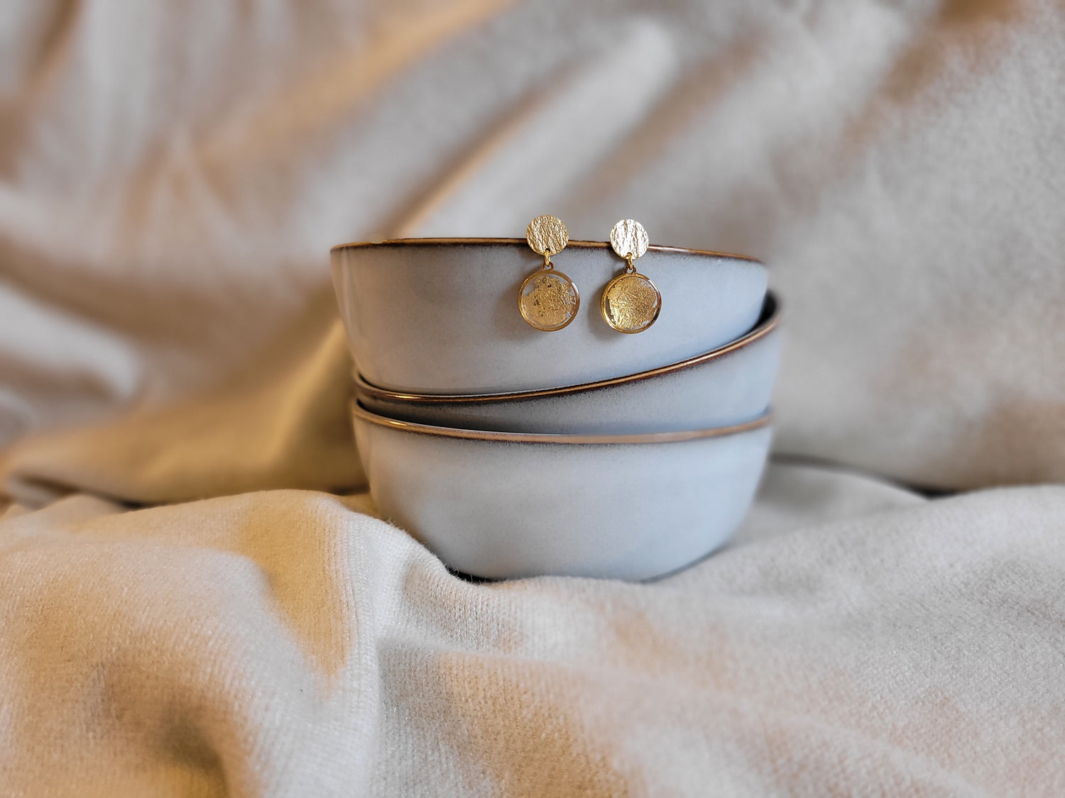 Chaque bijou est conçu et fabriqué à la main, en petite série, série limitée ou en exemplaire unique dans mon atelier à Saint-Germain-en-Laye. Les apprêts utilisés sont choisis avec exigence, principalement en laiton doré à l’or fin ou en acier inoxydable, issus de fournisseurs européens répondant aux normes REACH (sans plomb, sans nickel, sans cadmium).