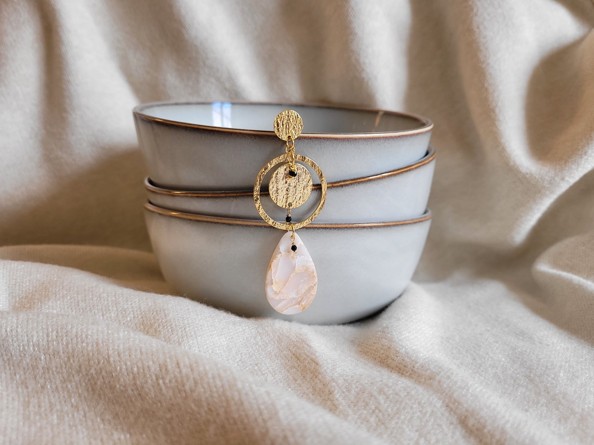 • Suspensions centrales texturés en laiton et pendants en forme de goutte